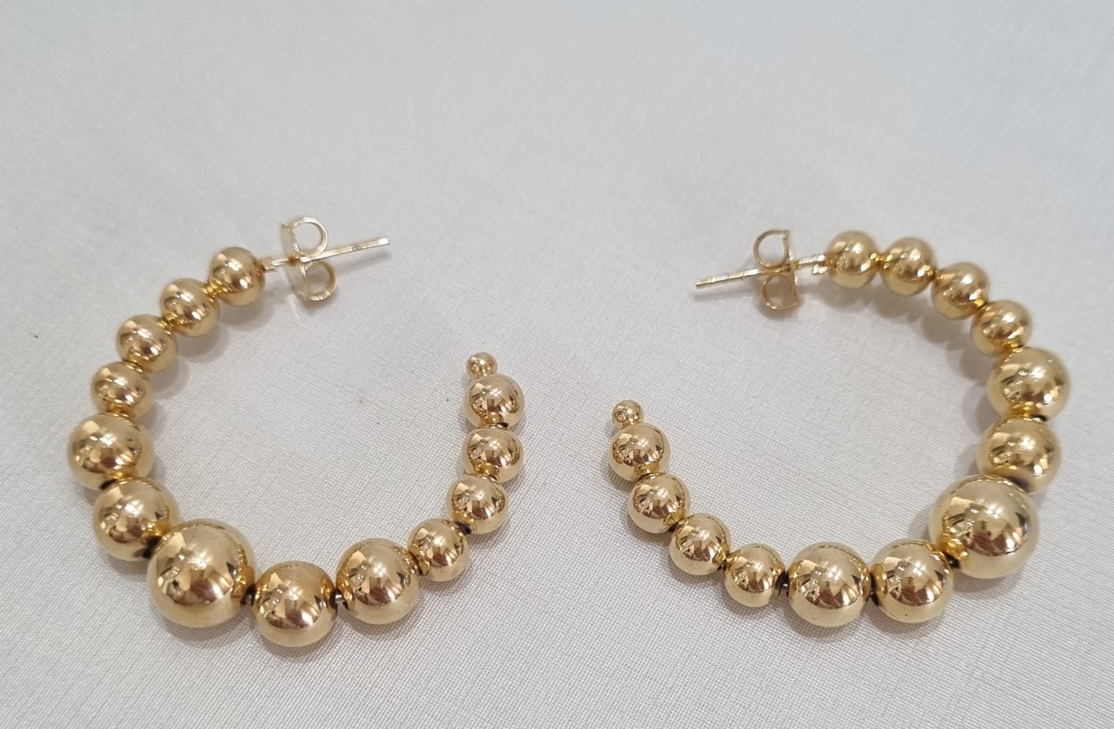 Brinco argola com bolas lisas, de tamanhos diferentes, em toda a circunferência.
